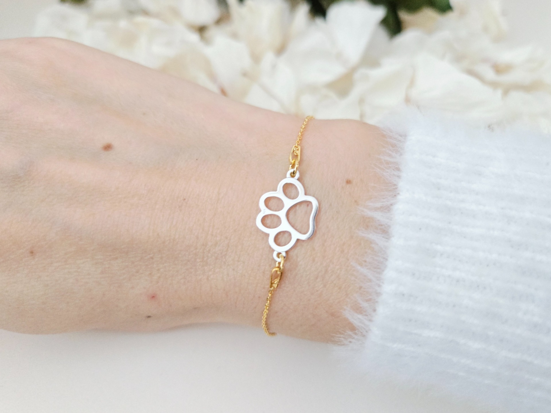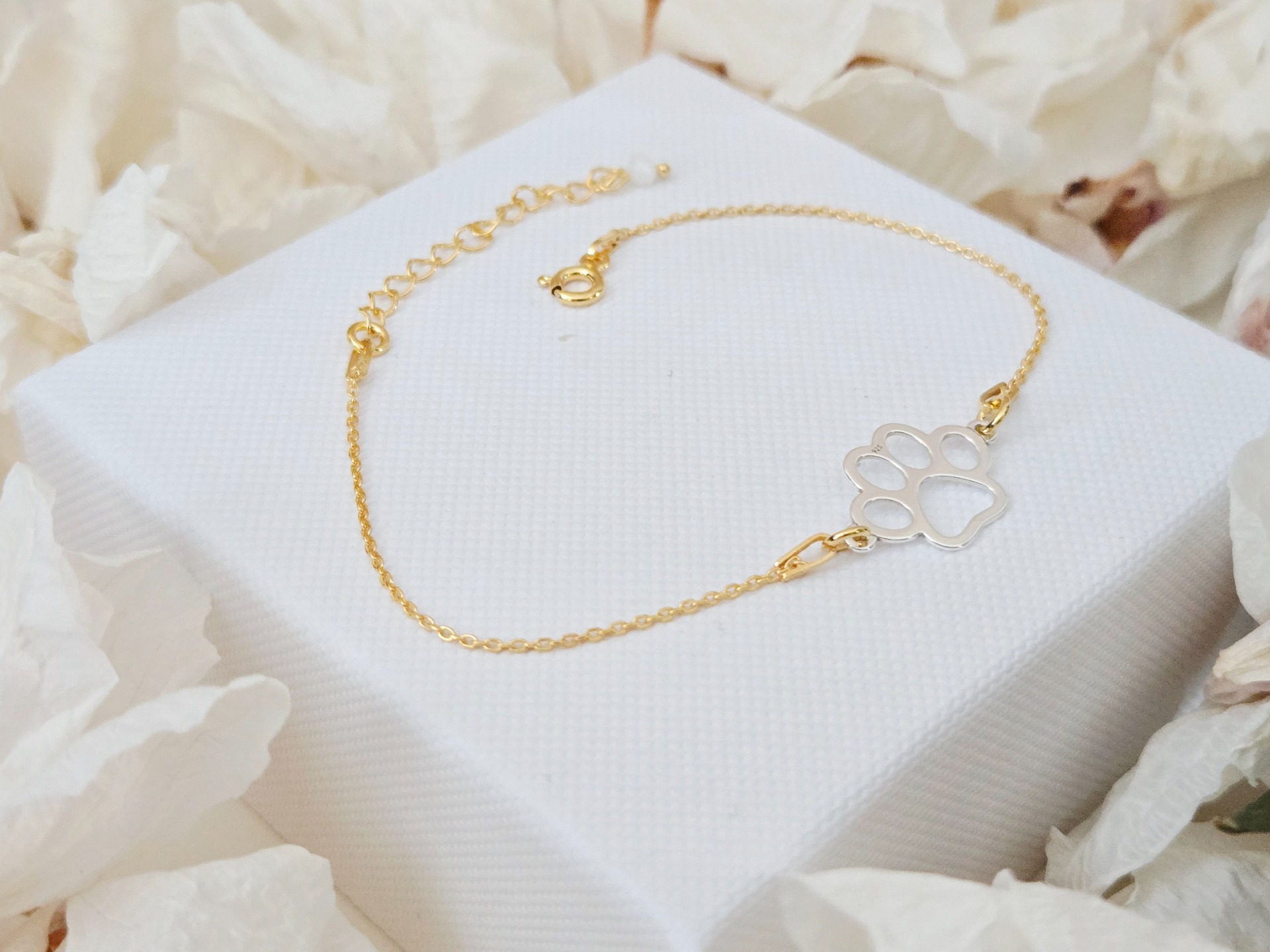 Materiál: strieborný retiazkový náramok z pravého striebra Ag 925 pozlátený 24k zlatom, medzikus v tvare labky z pravého striebra Ag 925