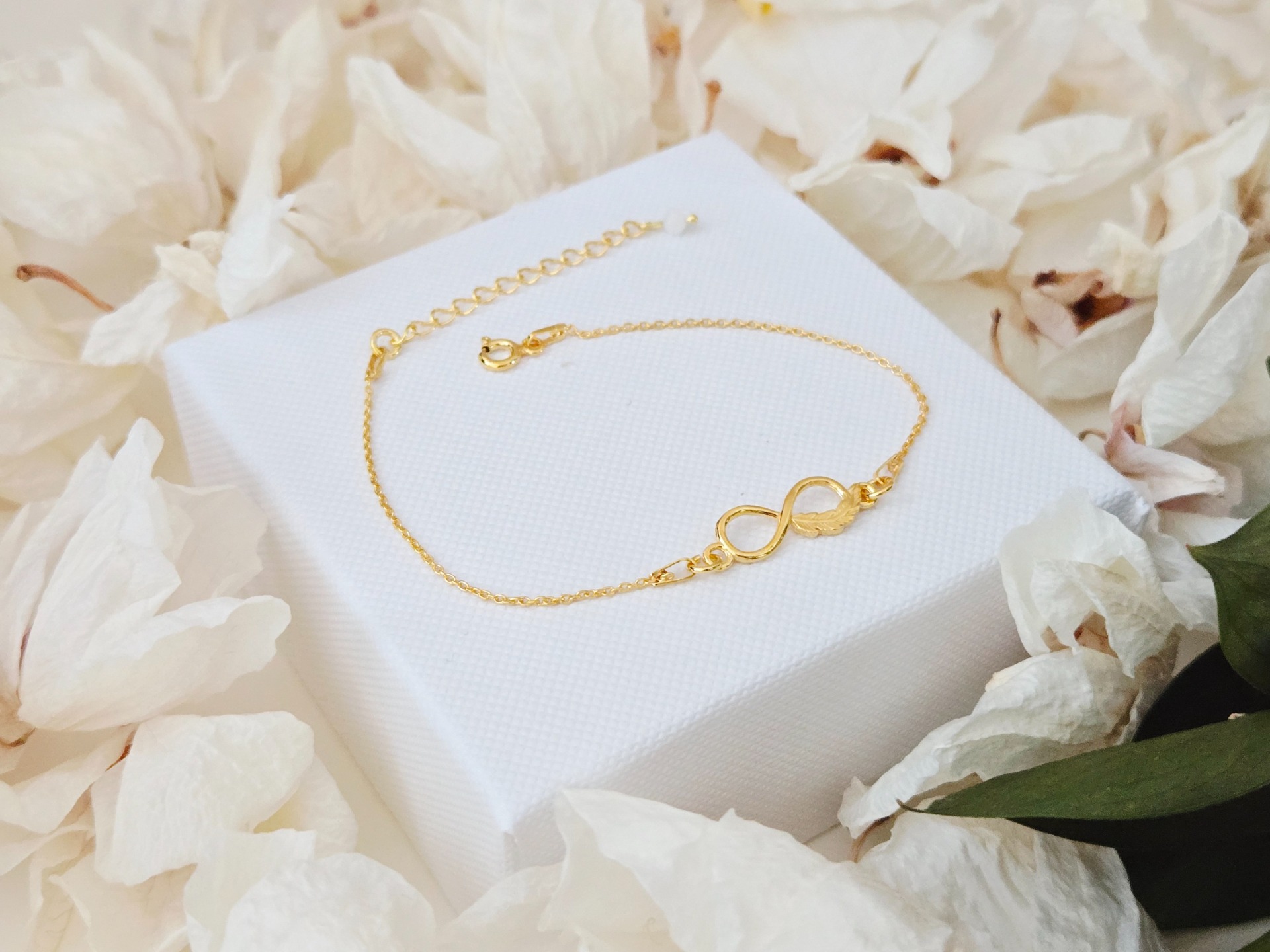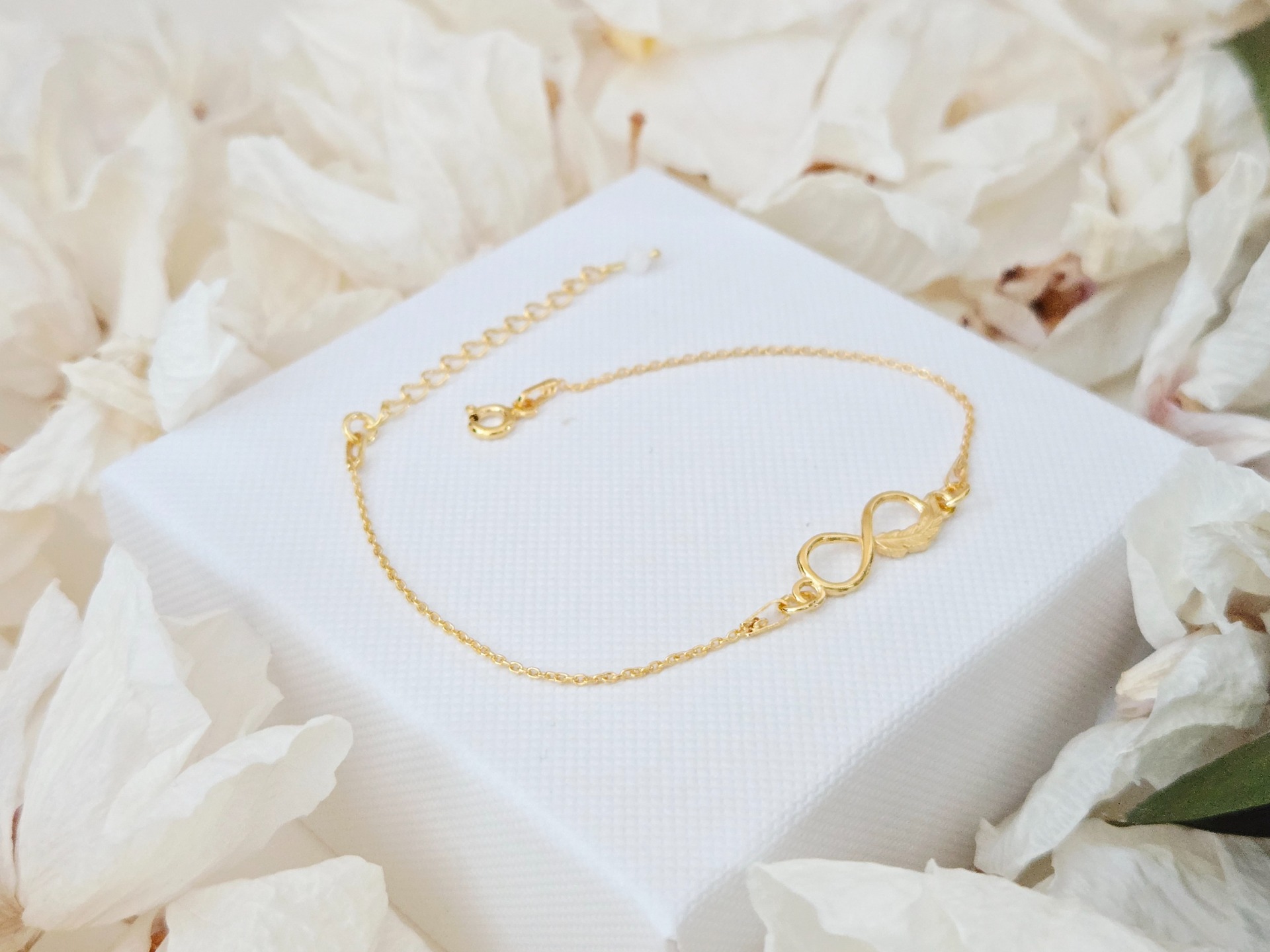 Materiál: strieborný retiazkový náramok z pravého striebra Ag 925 pozlátený 24k zlatom, medzikus v tvare nekonečna s pierkom z pravého striebra Ag 925 pozlátený 24k zlatom