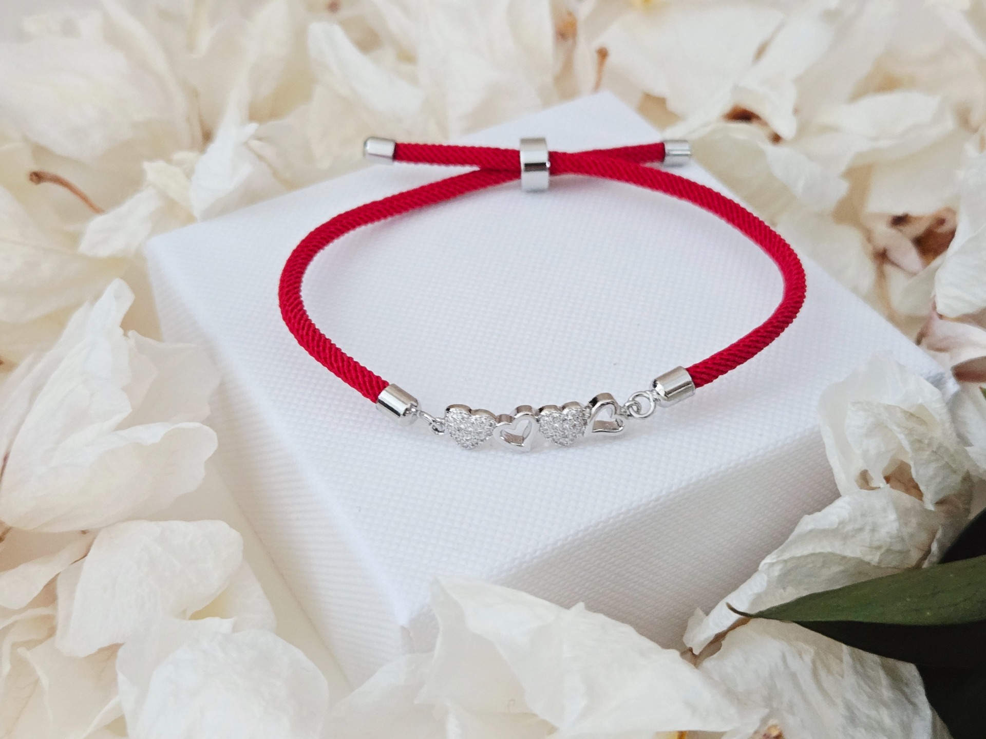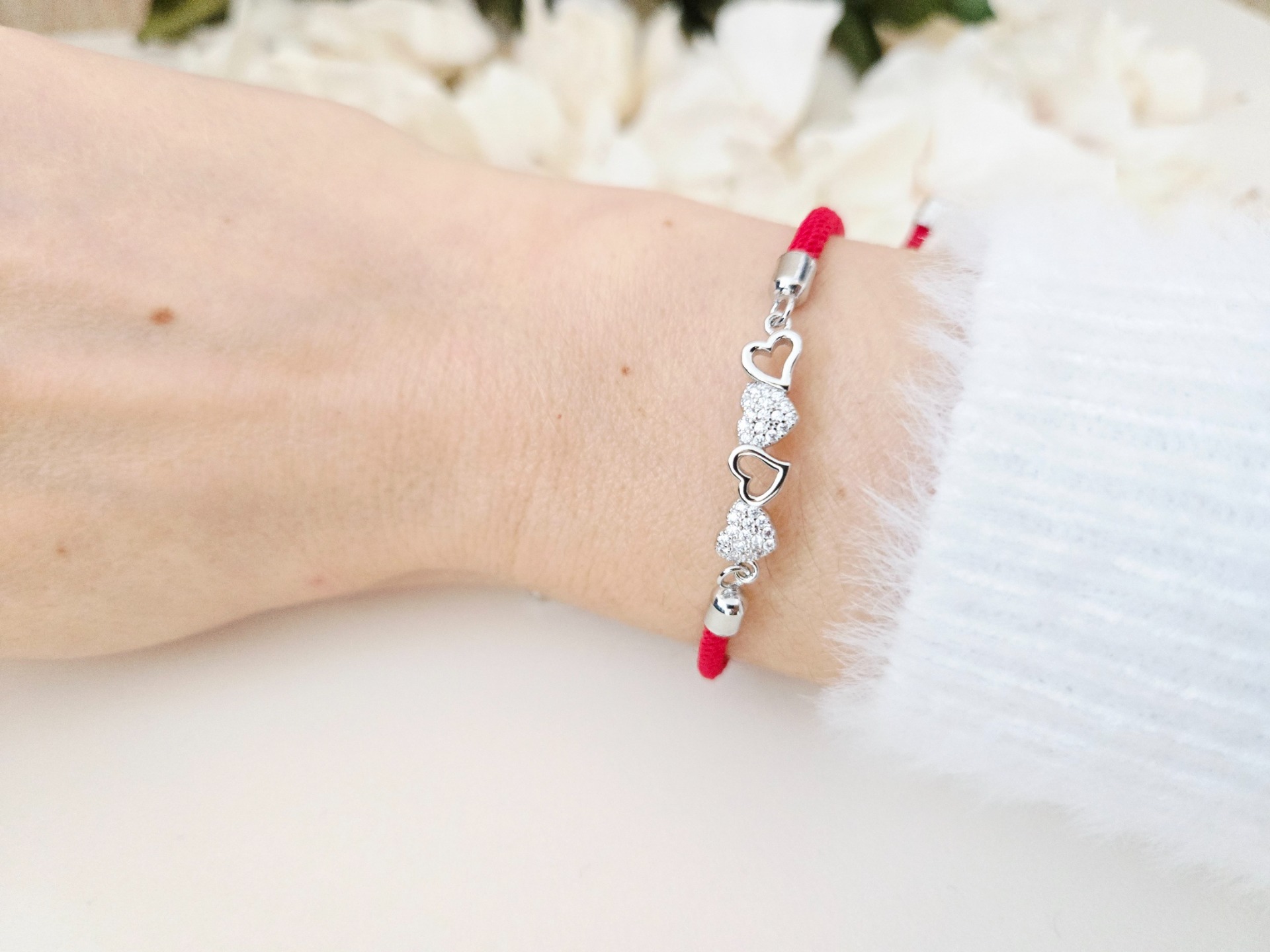 Materiál: náramok z nylonovej stáčanej šnúrky, medzikus v tvare štyroch strieborných sŕdc s bielymi zirkónmi